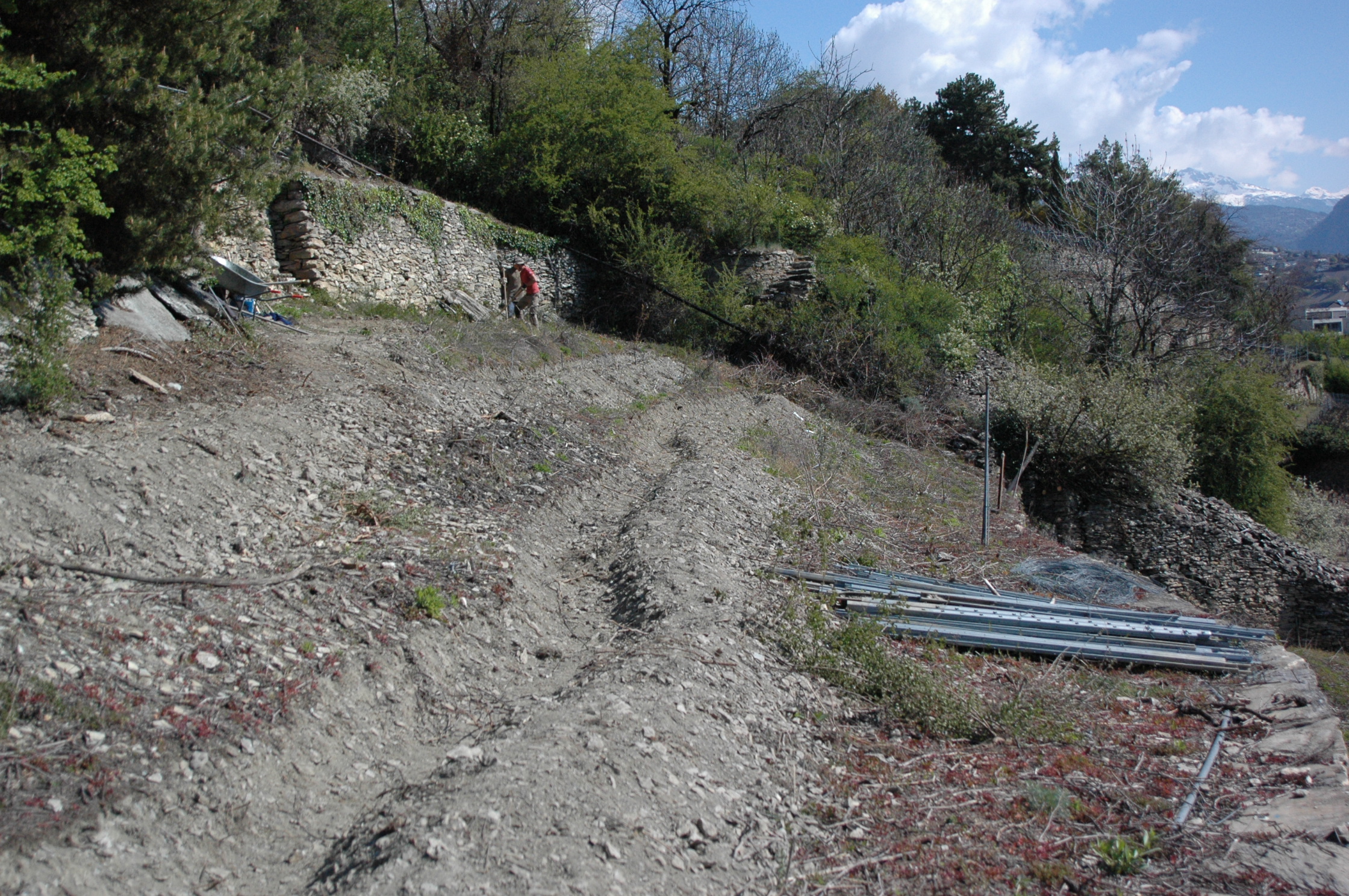 Le terrain était une vigne de 2500 mètres carré que nous avons enlevé pour mettre en place un conservatoire de plantes comestibles qui sont adaptées à des conditions de sècheresse et de fort ensoleillement. Il se trouve au dessus de la ville de Sion à proximité d’un site protégé qui s’appelle Mont d’orge.